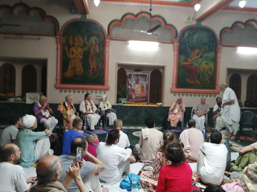 Luego viene el ishta gosthi una reunión de preguntas y respuestas en donde Prem Prayojan Prabhu responde a todas las dudas que puedan provenir ya sea de una clase anterior, visita a un lugar sagrado o de una situación personal