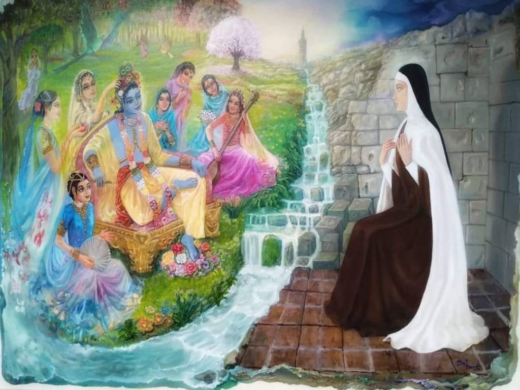 “Esto duró más de hora y media –que no podía apartar mi vista ni mi atención, y con gran deleite, cosa diferente de otras visiones; y lo que de allí saqué fue más amor a Dios y tenerle más profundamente presente con aquella belleza, no es posible que fuera imaginación”.De toda la teología de nuestro mundo, la descripción coincide con el Dios manifiesto en India hace cinco mil años, llamado Syam: negruzco u oscuro, también llamado Krsna que significa radiante, hermoso y supremamente fascinante.