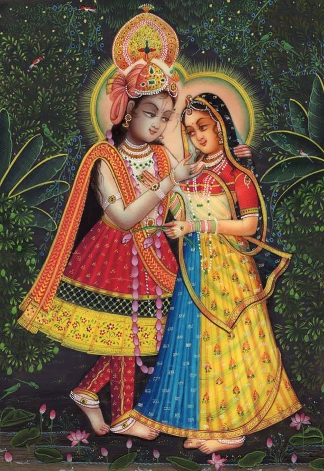 Un día en Vrindavana, a lo largo de la hermosa orilla del Yamuna, llena de flores de loto rojas, azules y amarillas que se mecían con la suave brisa de la fragancia a sándalo, Radha y Krishna caminaban juntos con los brazos colgando amorosamente uno sobre el hombros del otro, sin compañia. No había sakhis alrededor, y la Divina Pareja estaba de un humor extremadamente romántico.