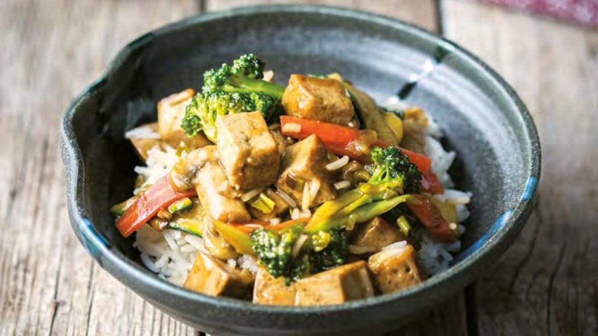 Saltear el tofu en el sartén con los condimentos. Sal a gusto. Agregar cilantro y perejil cortados finamente, brocolis y vainas (ejotes) al vapor. Sal a gusto