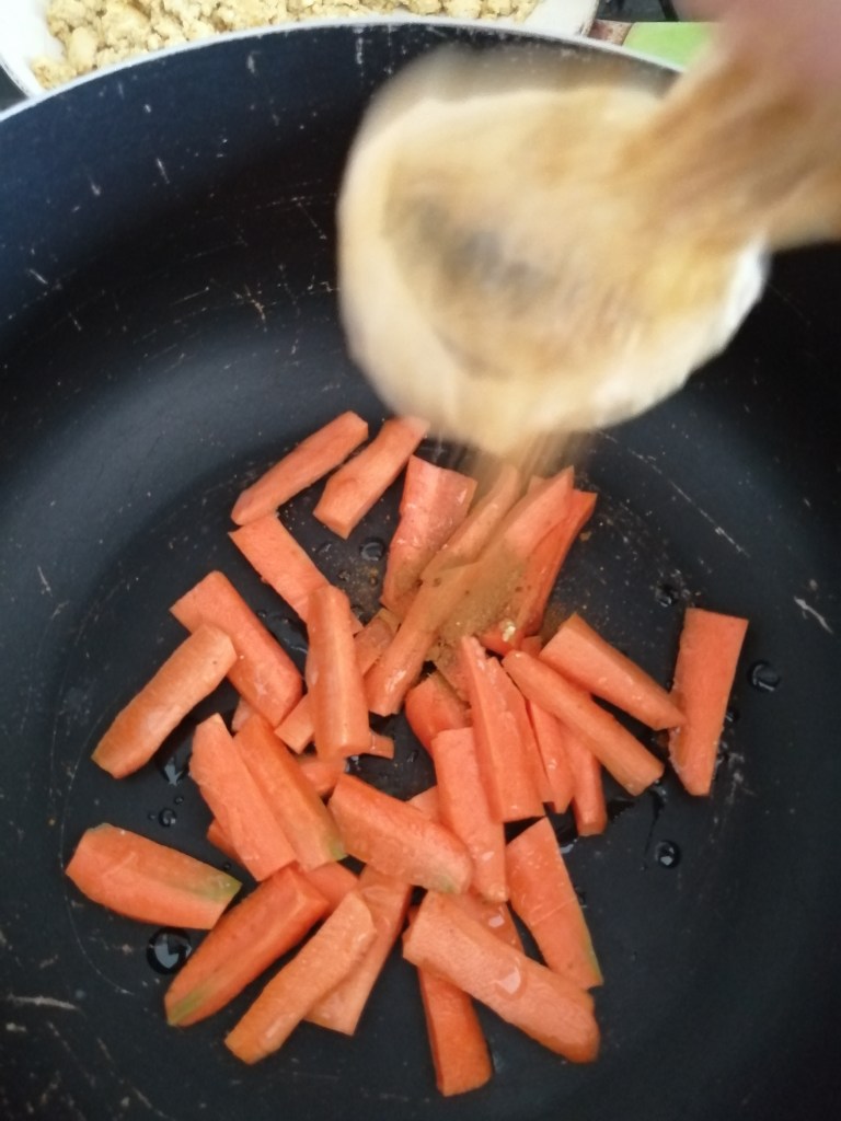 3. Mientras tanto en otra olla. Vierte un poco de aceite, retuesta con media cucharilla de la misma masala. Luego añade las zanahorias y cuando éstas estén a punto de cocerse añade el cilantro picado y las hojas de kale. Sal a gusto